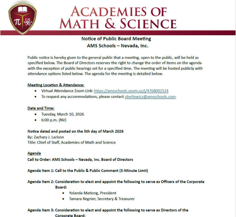 Beginning Fall 2026, the Academies of Math and Science (AMS) will open a tuition-free K–8 public charter school at the current Nevada Prep campus—bringing a nationally recognized model of academic excellence to the Las Vegas community.