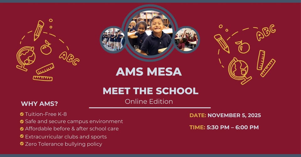 Exciting news, Mesa families! The Academies of Math & Science (AMS) is opening a new K–8 public charter school in Mesa in Fall 2026—and we’d love for you to learn more about what’s coming to your community!
